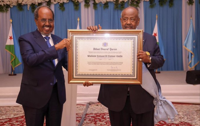Djibouti City, October 31, 2025 (HornCurrent) — In a historic and emotional ceremony held tonight at the Djibouti Presidential Palace, Somali President Hassan Sheikh Mohamud conferred Somalia’s Highest National Honor on Djiboutian President Ismail Omar Guelleh in recognition of his extraordinary role in shepherding the Arta Peace Process, which led to the birth of Somalia’s Third Republic in 2000.